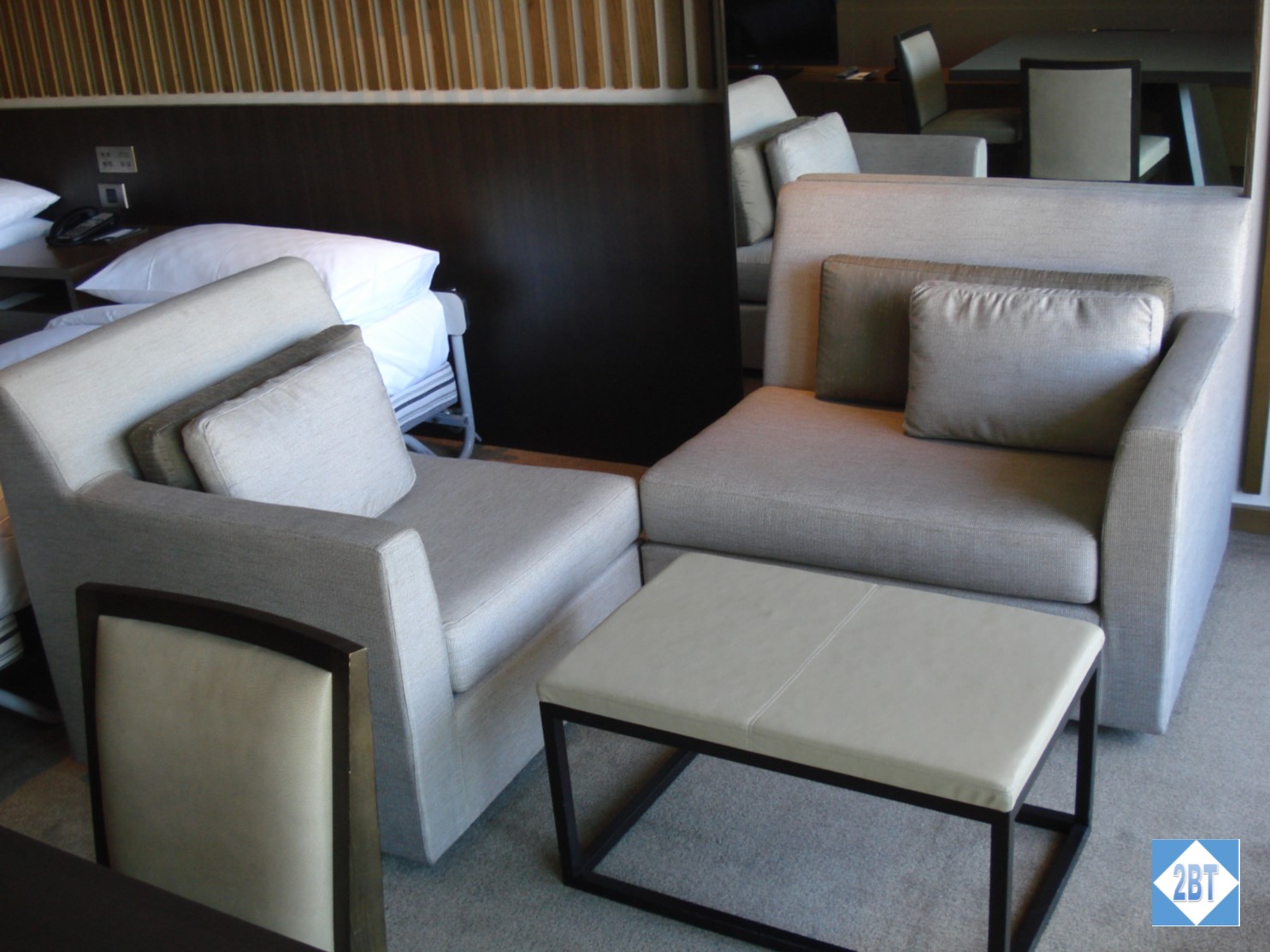 Across from the beds was a long, low chest with a bit of storage space and the TV sat on top of that. The desk sat at the far end, near the windows, facing the TV. Between the beds and the window was a small seating area with what appeared to be a sectional love seat that had been split apart and a coffee table/ottoman. It was a little close quarters here because of the extra bed in the room but we didn’t spend a lot of time sitting around anyway.