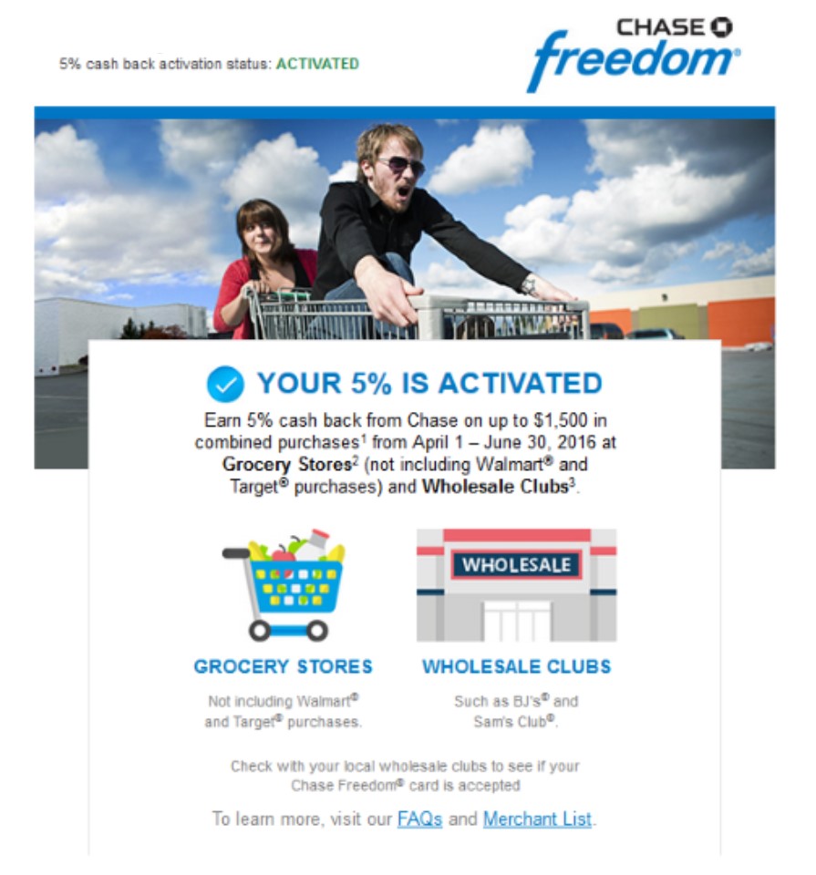 This quarter you can earn bonuses for up to $1500 in purchases at Grocery Stores and Wholesale Clubs. Note that most Wal-Marts and Targets do not qualify as grocery stores for this promotion. Wholesale Clubs like Sam’s and BJs will work too.