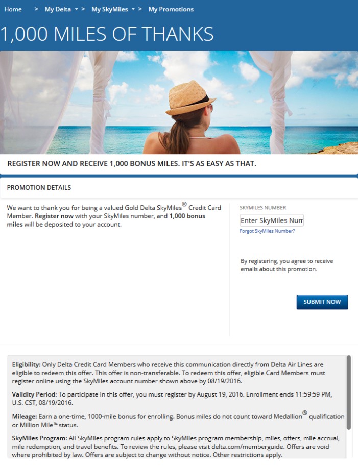 If you hold one of the co-branded Delta American Express cards, check for an email offering 1000 free Delta miles.