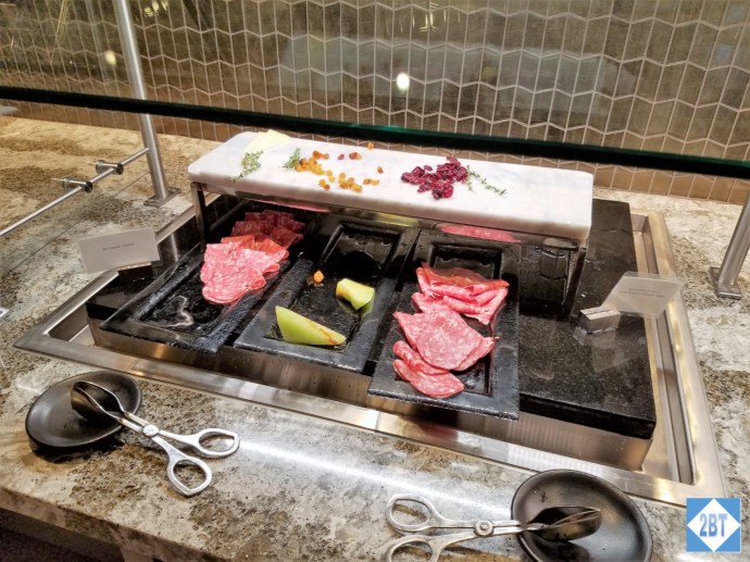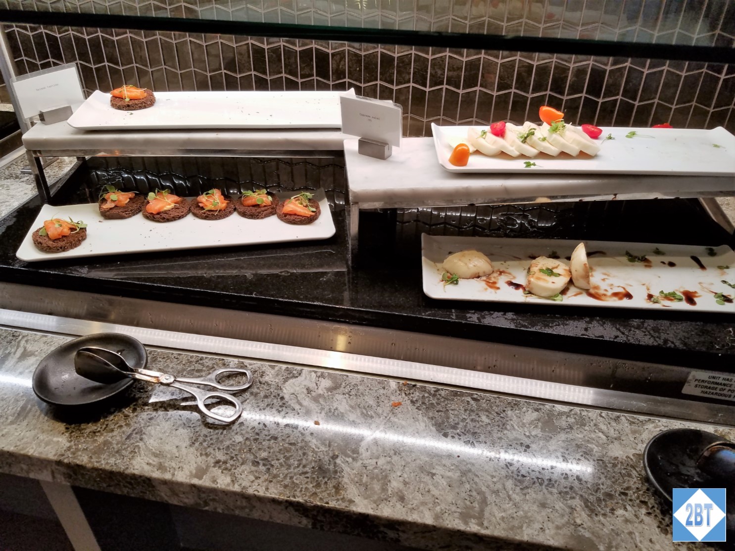 A small buffet was set up with skillet dishes like pasta, a really good salmon teriyaki, shepherd’s pie and other goodies. Off to the side were the pastries and desserts. Along the back wall were the canapes.