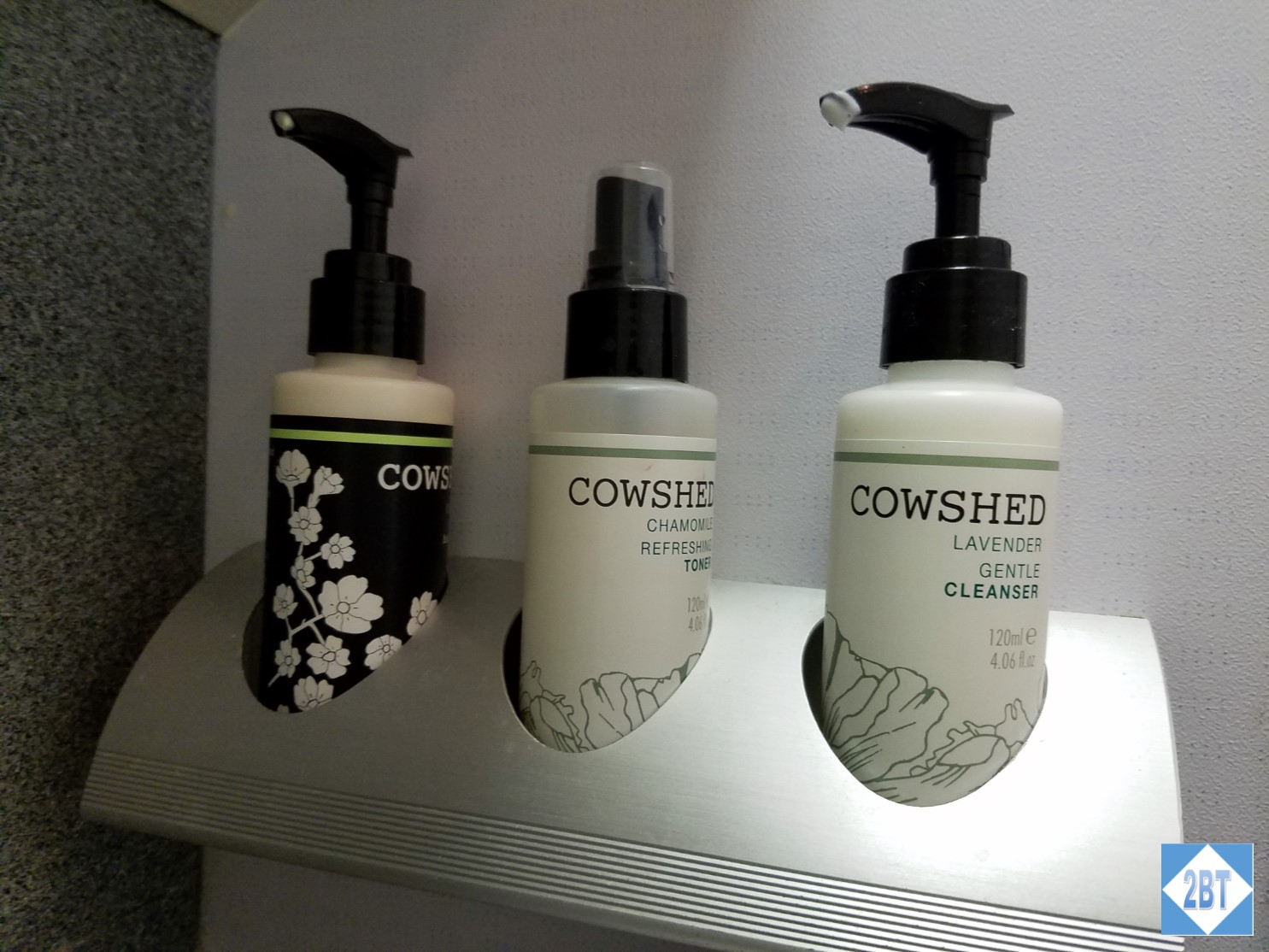 The amenity kit was a repeat of the one we’d received on the outbound flight. The lav was still small and still featured Cowshed products.