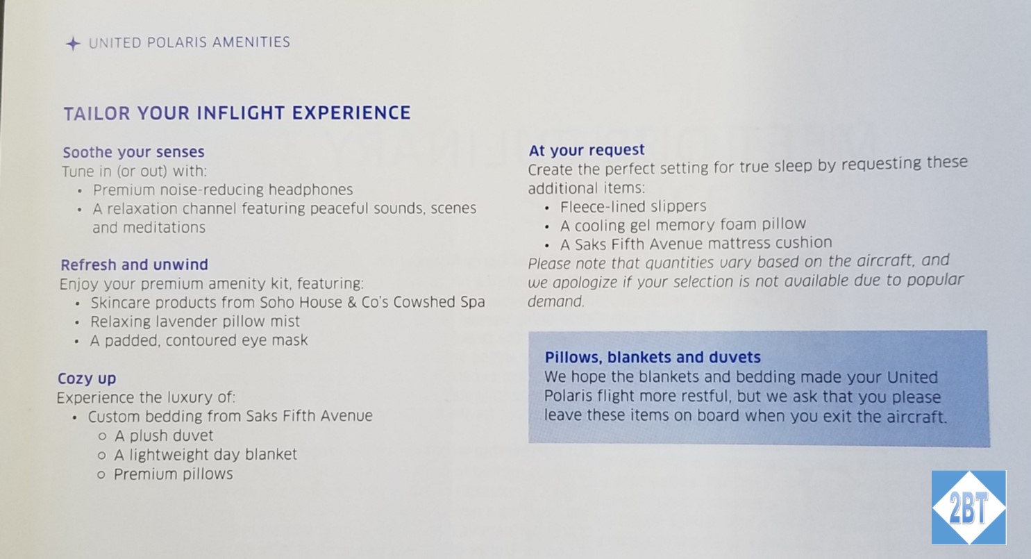 Anyway, this one extolled the Polaris bedding (odd that this wasn’t included with the overnight flight version):