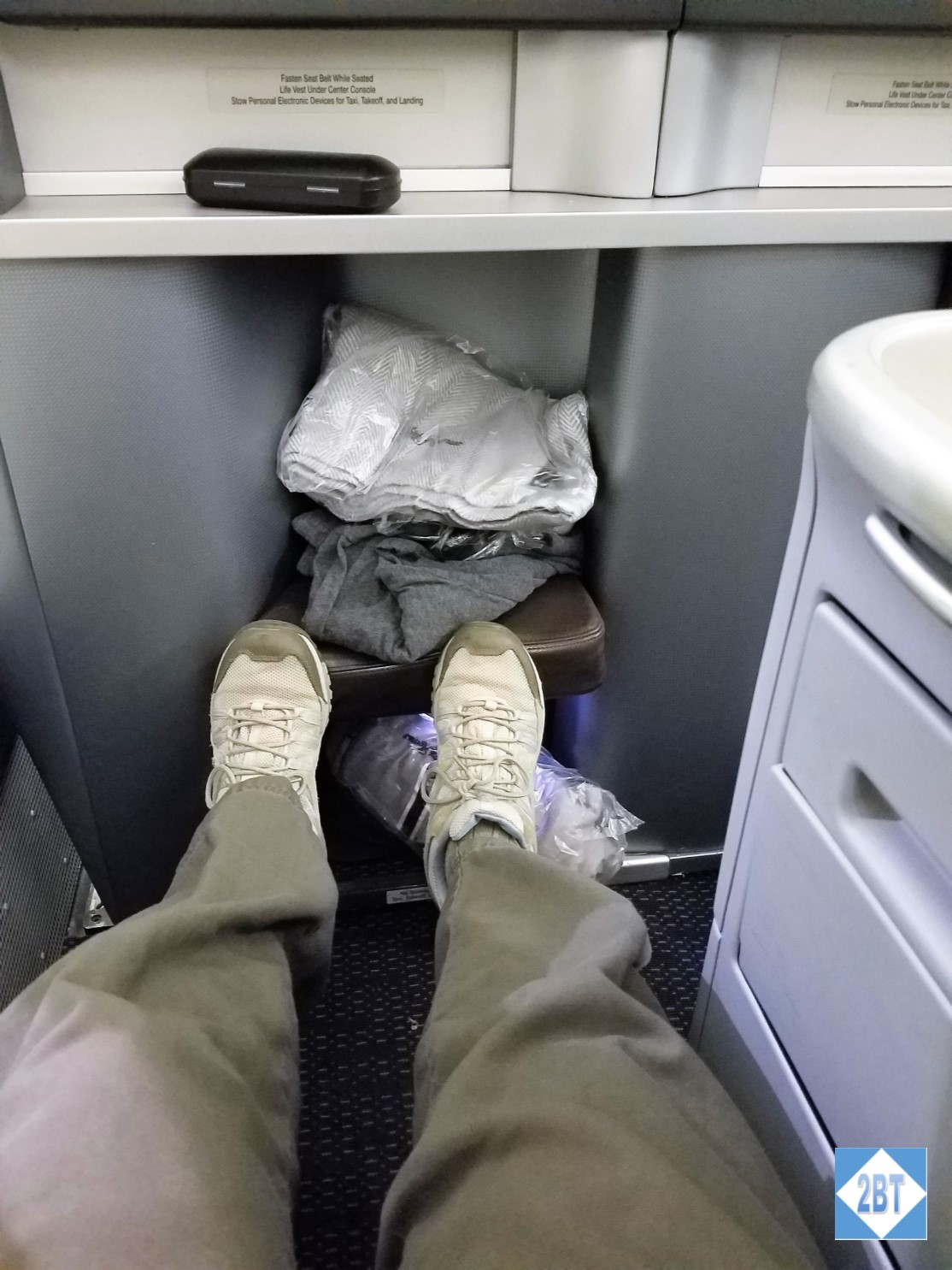 After leaving the Polaris lounge, our gate was just a few steps away. By the time we arrived, orderly lines had already formed for zones 1 & 2 so we took our place at the end of zone 1. It wasn’t too much longer before boarding began. Everyone entered through door 2L so we turned right down the first aisle to our seats, which were the last two business class seats on the right and faced forward.
