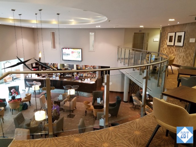 Looking at the bar from the second level. The door visible at top right leads to the gym and the windows over the bar look into the gym itself.