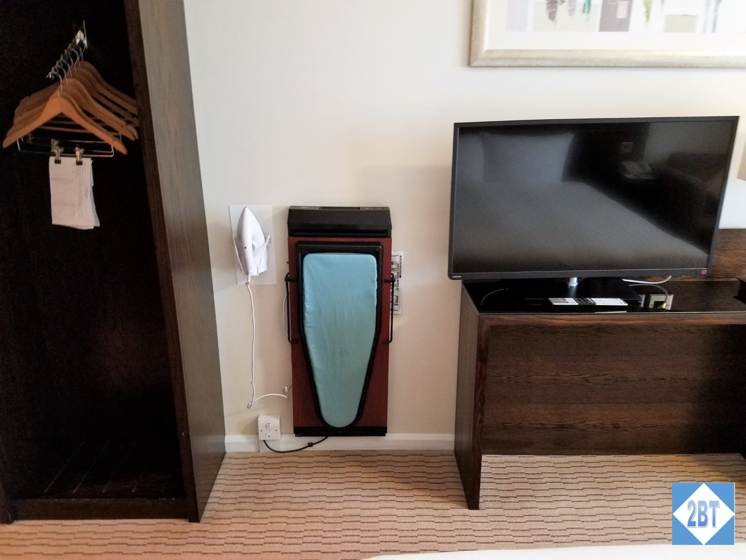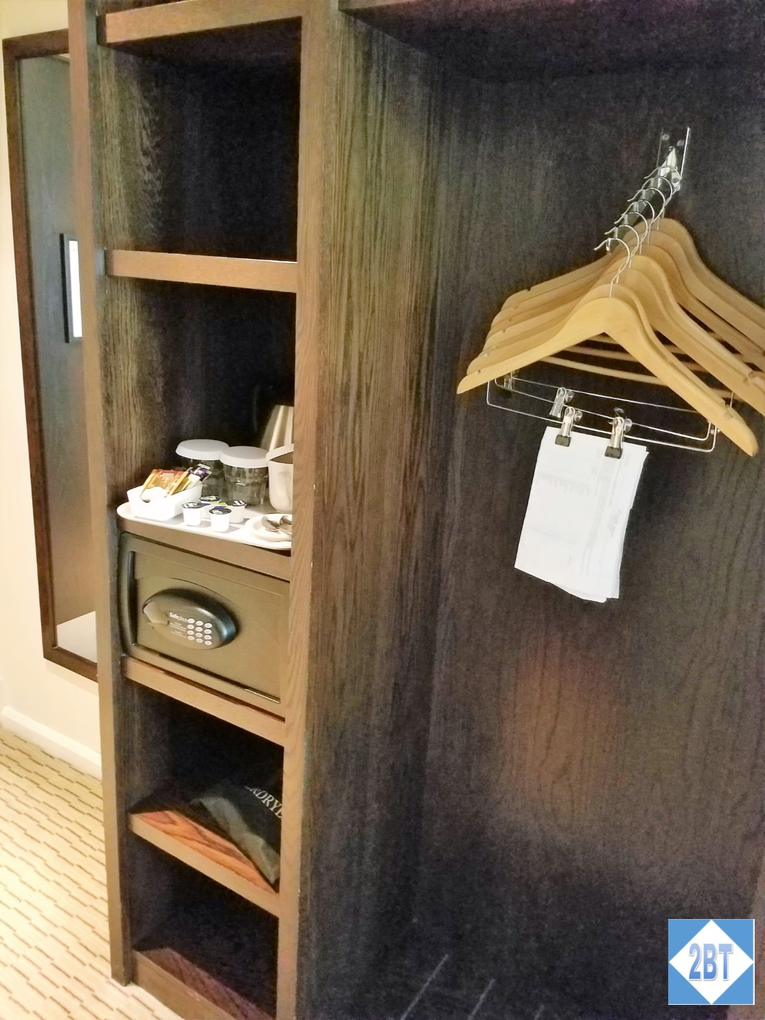 Between that table and the closet was a small ironing board and iron, both appeared to be permanently attached to the wall. The closet had plenty of hangers for a one-night stay and several shelves. The safe and coffee/tea station occupied the middle of the shelves and that was the hair dryer’s home too.