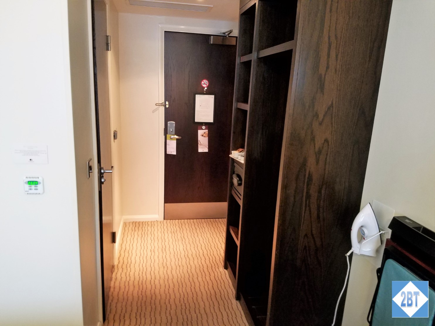 It had the standard hotel room layout: short entry hall with a closet on one side, bathroom on the other, then the room opened up with the bed on one side and desk on the the other.