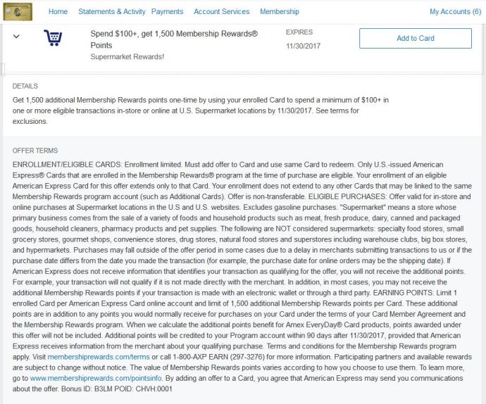 This offer should be a piece of cake for just about anyone. Spend $100 in a single transactions or multiple transactions between now and when the offer expires on 11/30/17 and get 1,500 additional Membership Rewards points. There’s not even a need to do manufactured spending on this as even those of us who don’t cook can spend $100 in three months!