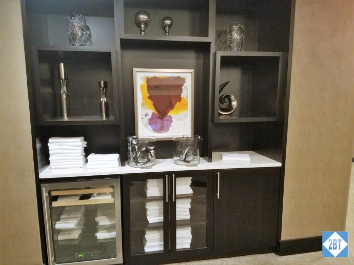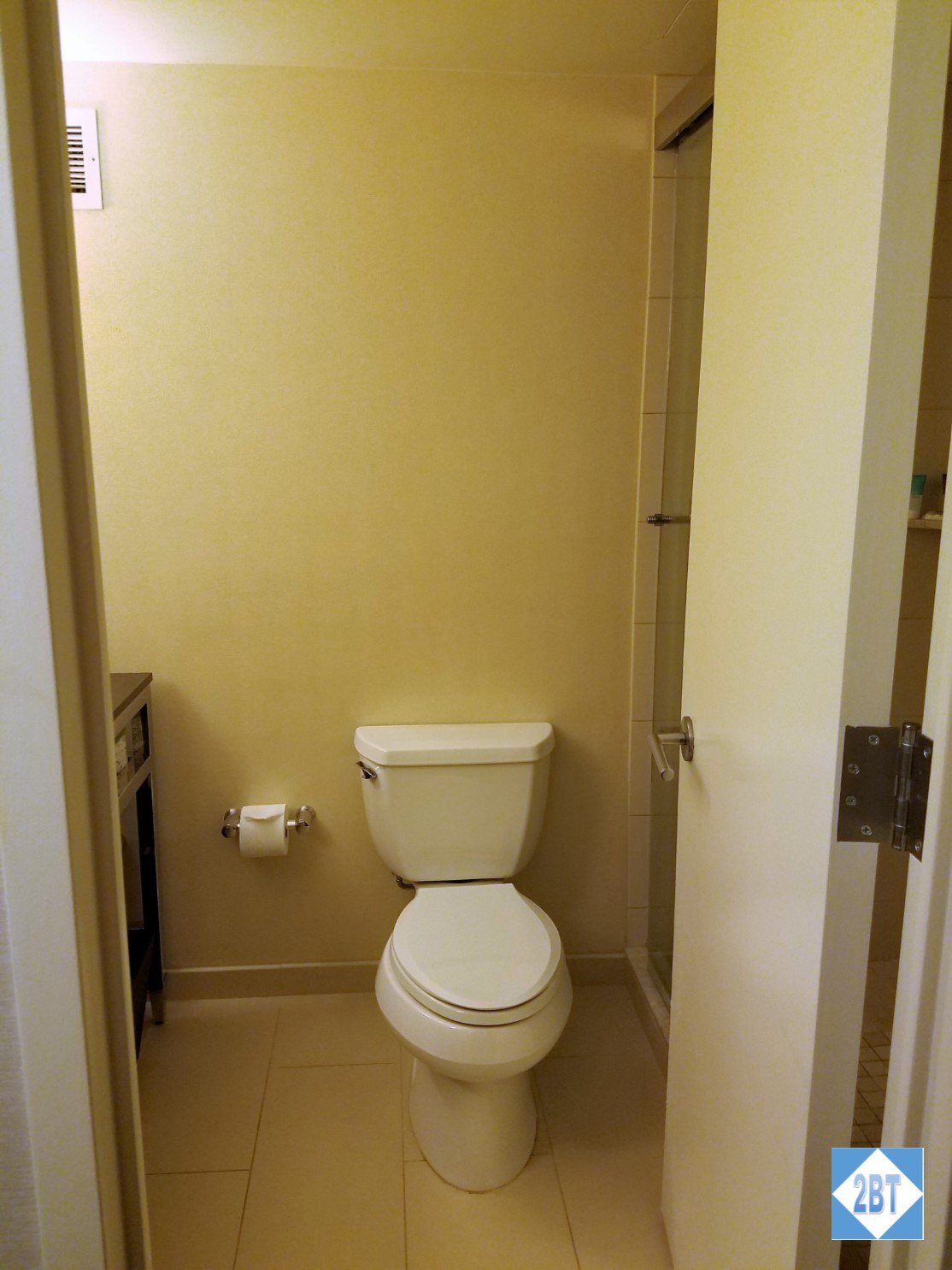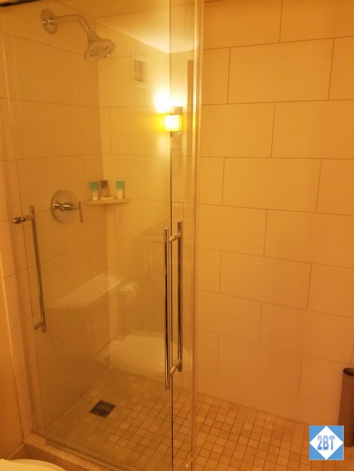 The bathroom had the vanity and sink on one side (I liked the stainless features), the toilet in the center and the walk-in shower on the other side. My first complaint about the bathroom was the lighting. It was extremely dim and yellow. Yes there was a lighted makeup mirror which helped up close, but the wall lights gave the whole bathroom a sickly glow. My other complaint is the water pressure. I thought perhaps it was a fluke on Saturday morning when there wasn’t much pressure but I had the same issue on Sunday. I like a very strong shower pulse and this just didn’t get it done, especially since the water at this hotel is EXTREMELY soft, which meant it was quite difficult to get the soap off your hands and body whether taking a shower or just washing your hands. The shampoo, conditioner, shower gel and bar of soap already occupied the shelf in the shower. It’s nice that the shelf is big enough to accommodate all that at once. But that still left me nowhere to put my razor and shave gel except on the floor. An additional shelf would be a good step up as would some sort of low shelf to prop my leg while shaving.