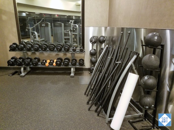 The gym is on the 32rd floor, across from the Regency Club. The room follows the curve of the building and offers views of the Mercedes-Benz Superdome (home of the NFL’s Saints) and the Smoothie King Center (home of the NBA’s Pelicans). There were a number of treadmills, some elliptical machines, a few bikes, a reasonable selection of weight machines as well as hand weights and other assorted accessories. I got there just before closing time and it was empty on Friday night but each of the next two mornings there were several folks making use of it while I ate breakfast.
