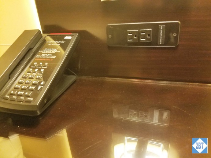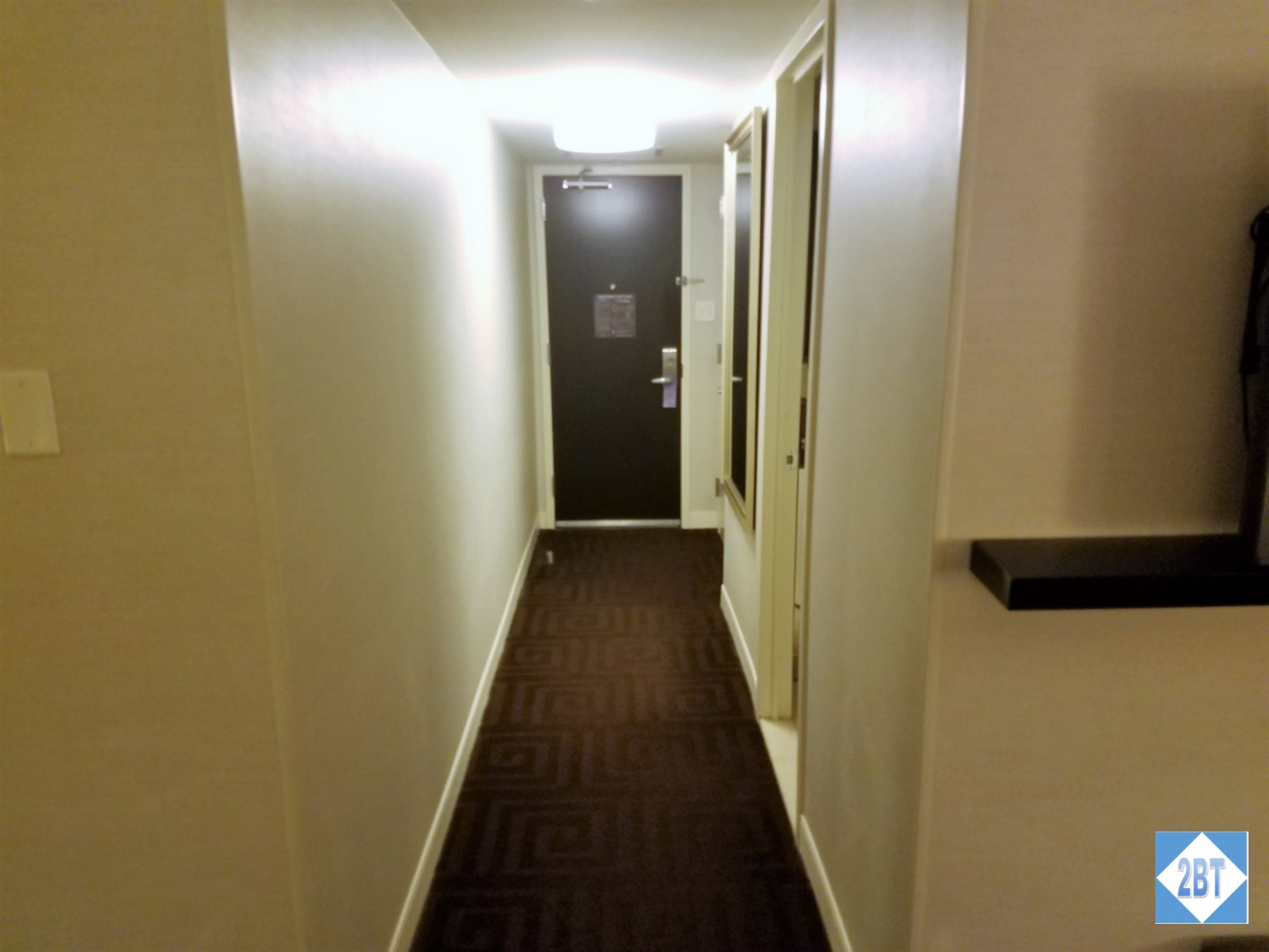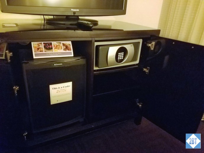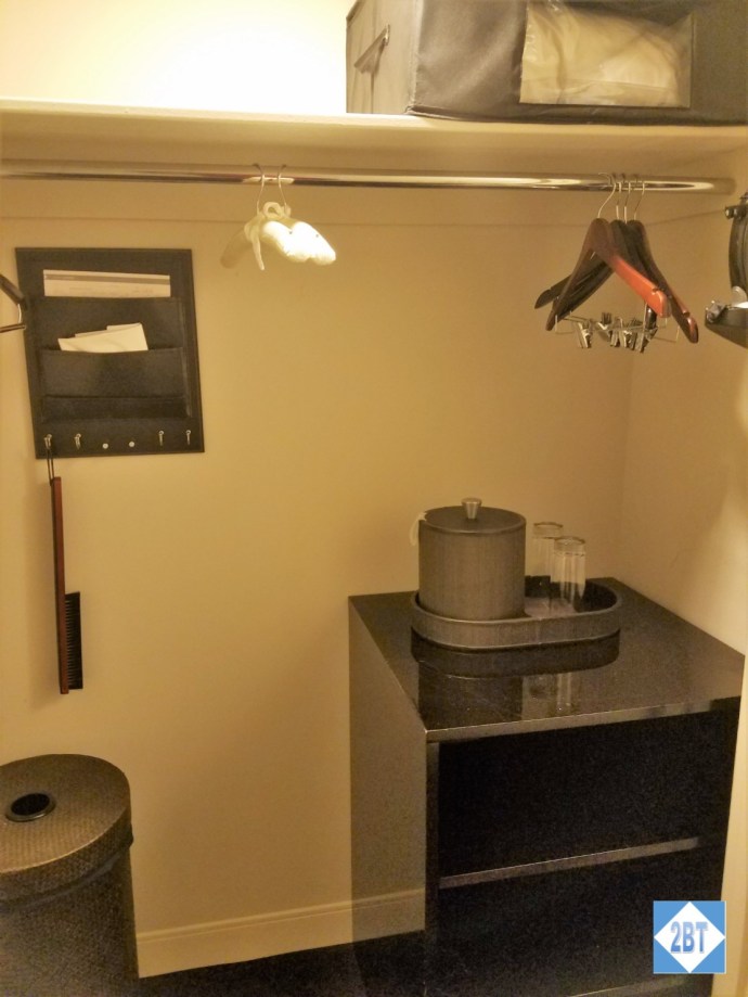 There were a couple of shelves below the safe in the bedroom and inside the closet were several shelves on one side and there was the overhead shelf that ran the length of the closet. There was also a laundry hamper in the closet, not something I believe I’ve ever seen before in a hotel. The whole arrangement just struck me as strange but since I was only there for two nights it didn’t bother me too much.
