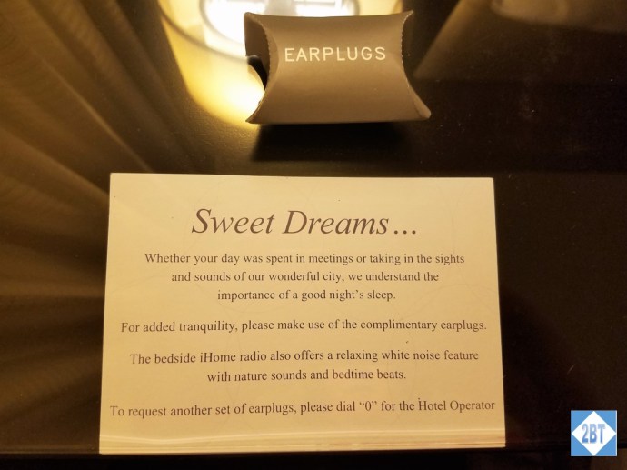 On one bedside table I found this note. I think this is a great idea, even though I did not use either product. This hotel is right beside some venues that could be used for concerts and noise could be an issue at times. The hotel has implemented a quiet period in its hallways after 9 PM but we all know that can be ignored if there are intoxicated folks around.