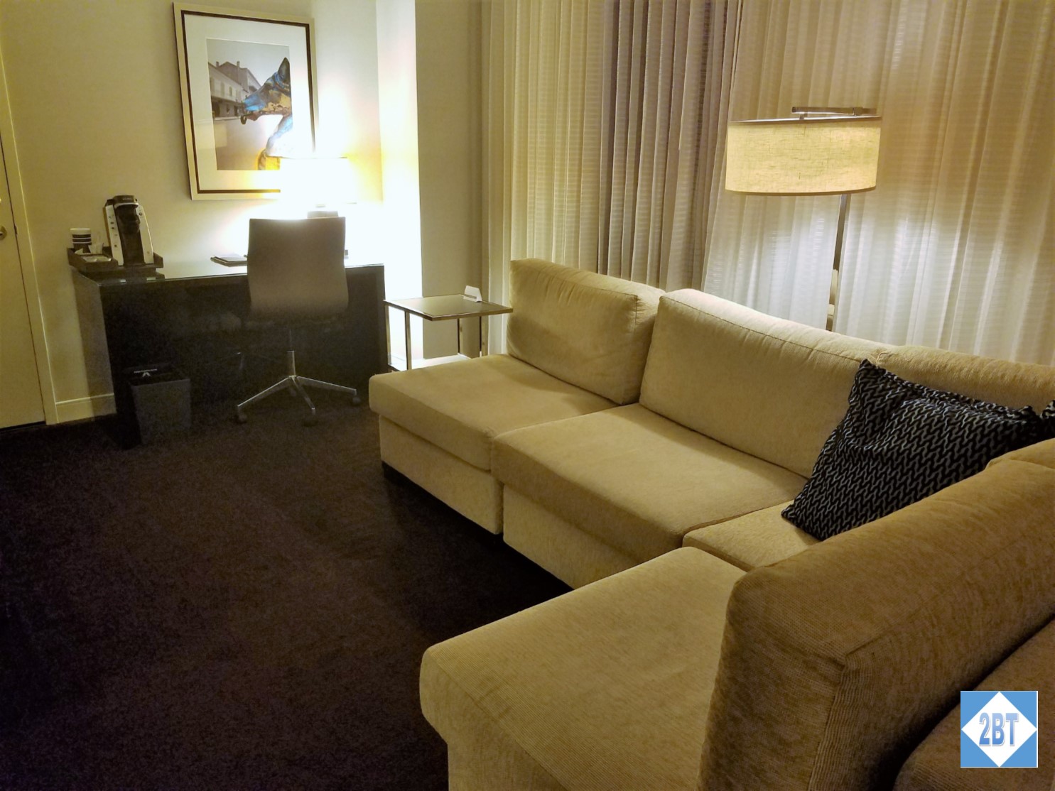 At the end of the hall was the living area that featured a sectional sofa (not a sleeper, however) with a desk and a wall-mounted TV. Mine was a connecting room so to the far left, beside the desk, was the connecting door.