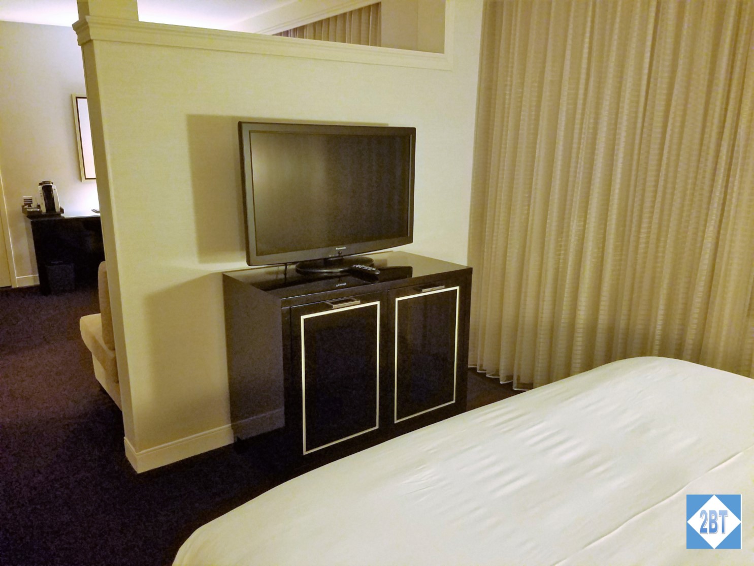 To the right was a wall with an open doorway into the bedroom. I had a king bed with two built-in side tables. Against the wall between the living area and the bedroom was a tall chest upon which the TV sat. The chest contained the mini-fridge (with 2 liter-size bottles of water – complimentary thanks to my Discoverist status) and the safe.
