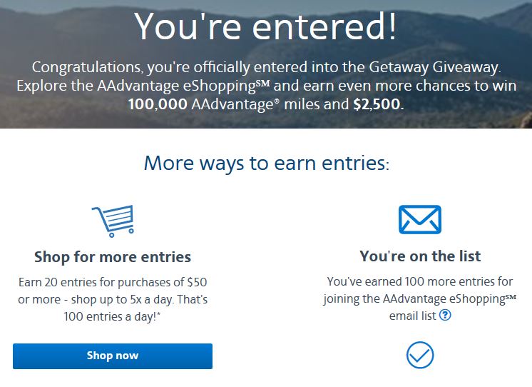 American Airlines will give away 100,000 miles + $2500 to one winner. Three first prize winners will each receive 20,000 AA miles. No purchase is necessary and you must enter by September 29, 2017. You can earn 100 additional entries by signing up for the AA eShopping email list.