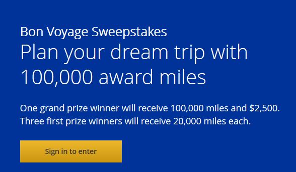 United is offering a similar promotion with their Bon Voyage Sweepstakes. One winner gets 100,000 UA miles + $2500 cash and three first prize winners get 20,000 miles apiece.