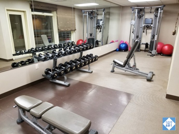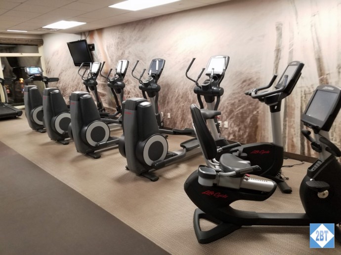 The entrance to the gym is just off the side of the restaurant, on the same wall as the elevators. The room is L-shaped, though the two legs of the L are a bit more equal. Along one side were the towels and a small fridge with bottles of water.