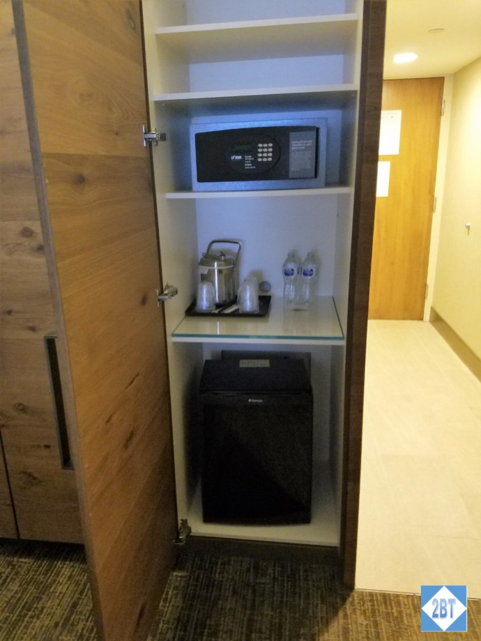 Next to the closet was another door with shelves and housed the safe, tea service, complimentary (!) bottled water and the fridge.