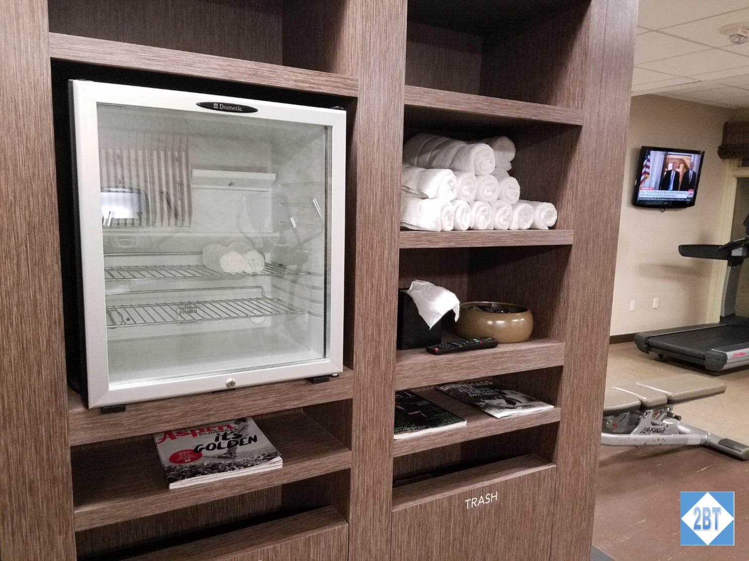 The entrance to the gym is just off the side of the restaurant, on the same wall as the elevators. The room is L-shaped, though the two legs of the L are a bit more equal. Along one side were the towels and a small fridge with bottles of water.