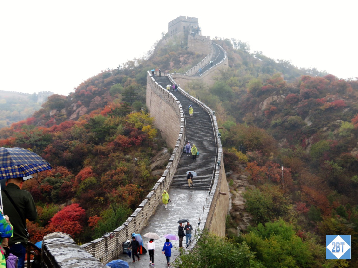 After an early breakfast we boarded the motorcoach and drove about 1.5 hours northwest of the city to the area of Badaling where there’s a well-preserved section of the Great Wall as well as all of the tourist shops. It rained the whole time on our drive out and it rained most of the time we were climbing the wall and I do mean climbing. I was surprised at how steep it was in sections – and some without stairs so it meant walking up steep inclines on slick, centuries-old stones. The only good thing about the weather is that it kept the tourist traffic down. I’ve seen photos where the walkways were so crowded you could barely move but that was not the case during our vist. Unfortunately it meant our photos didn’t come out great but it was definitely a thrill to get to see it.
