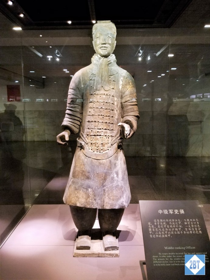 Seven of these High-Ranking Officers, or Generals, were found in these pits. He wears double-layered robes beneath his armor and a hat that ties beneath his chin. His shoes have square openings and upward-bending tips.