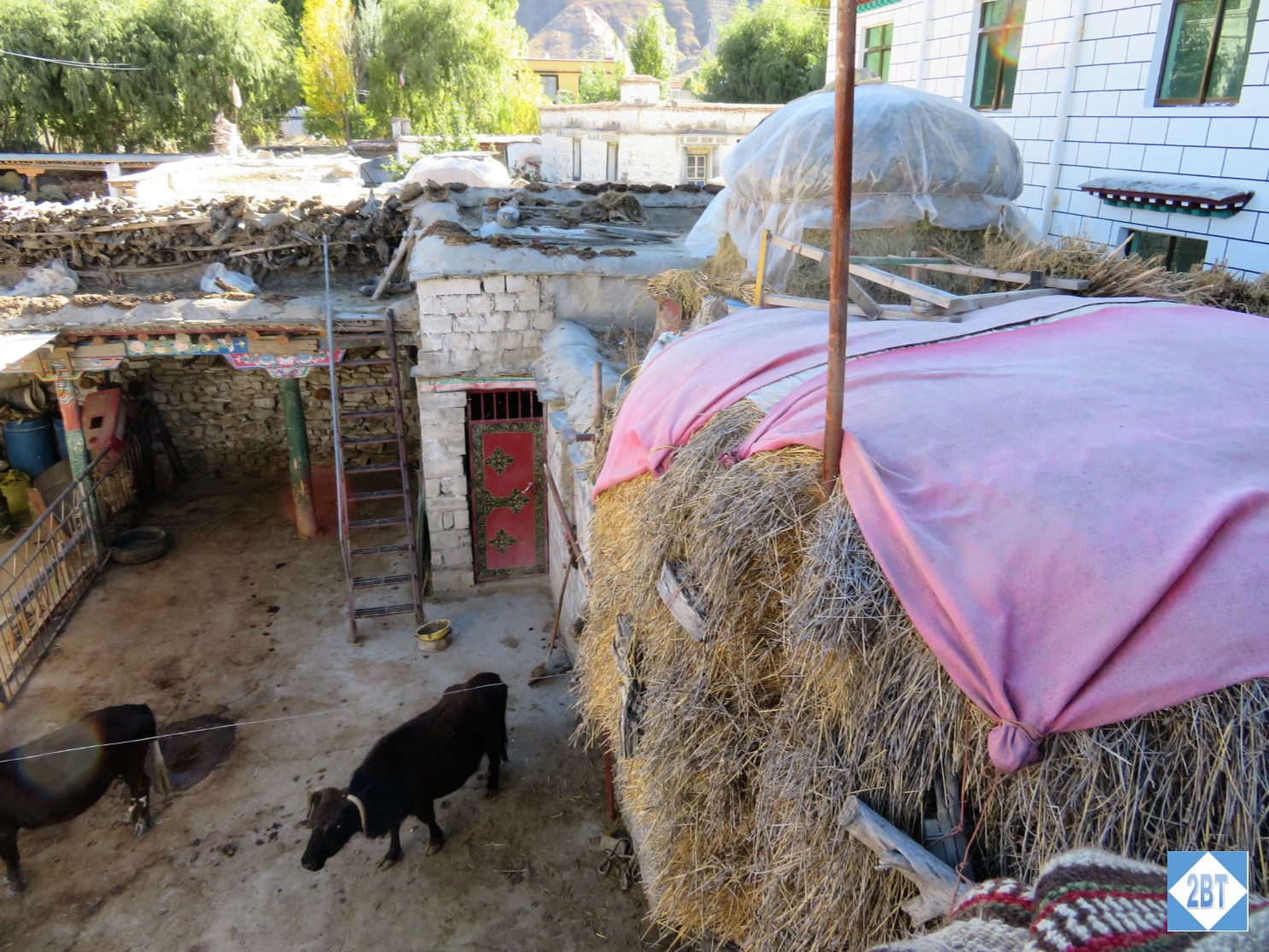 From the upstairs patio, which also held the solar panels, we could see down into the corral where the yak were kept alongside giant stacks of hay. The roofline of the corral was wide enough that bundles of wood were stacked in advance of the winter.