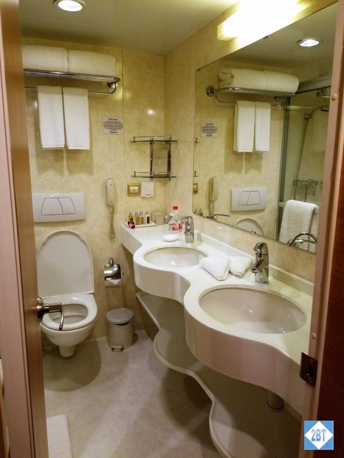 The layout of the Suite and of the regular Veranda rooms are quite similar, but the elbow room is significantly different. In some ways the cabins feel like a regular hotel room upon entering: a bathroom on one side, a wardrobe on the other, then step into the area with the beds and beyond that is the balcony.