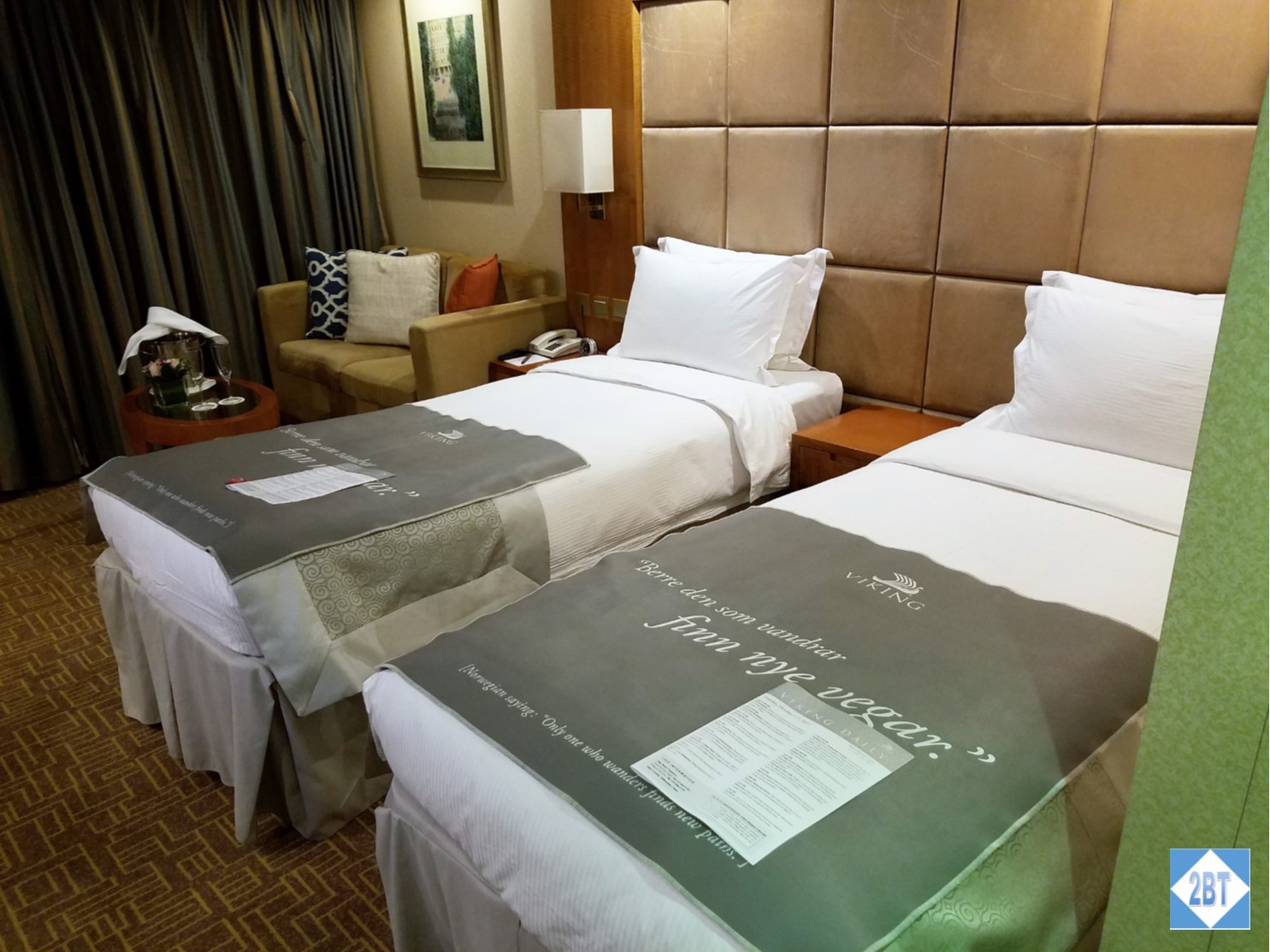 Our beds were waiting for us with the latest copy of the Viking Daily, the newsletter we’d find on our beds each night telling us about the next day’s plan. I like the rubberized cover that is on the beds when we check in, it’s a simple tool that allows us to put our suitcases on the beds without worrying about getting the duvet dirty. During turndown service the housekeeper simply rolls those up and tucks them out of the way for the rest of the trip. All cabins can have the beds joined together or split apart, which is night. Only downside was there were no outlets near the bed.