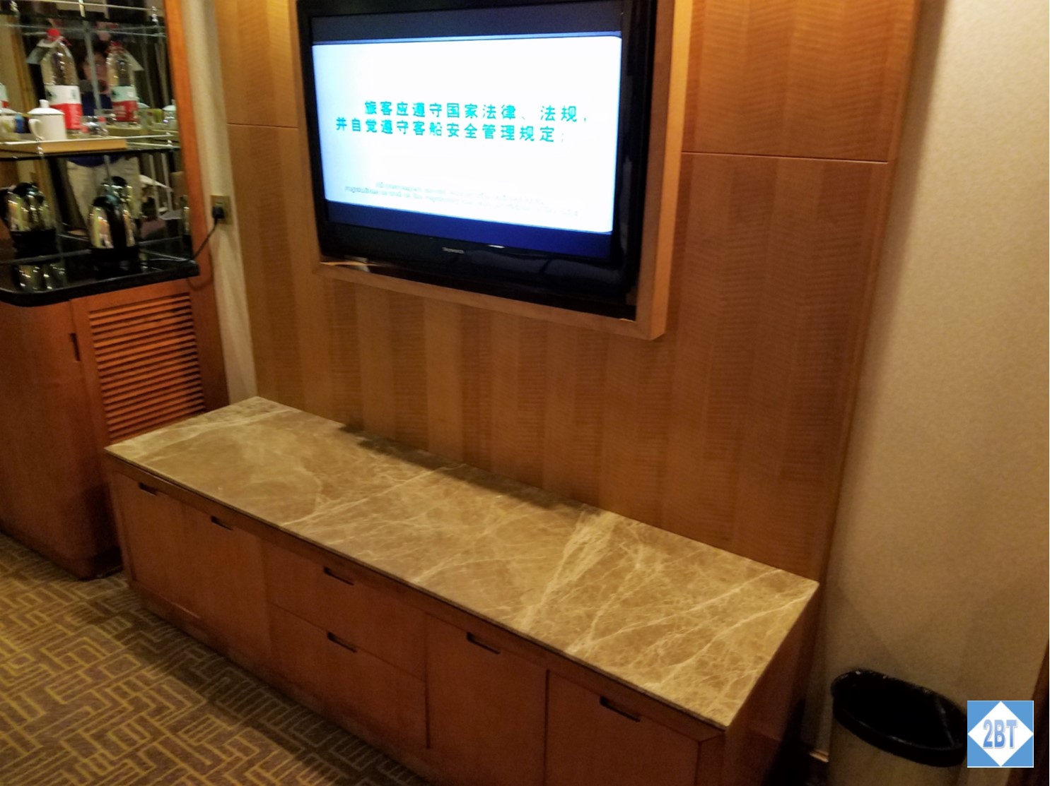 To the left of the desk was a wall-mounted TV with a low counter and drawers. This is where the suite really started to distinguish itself from the Veranda cabins. The Veranda cabins are much narrower so there was no storage space at all below the TV.