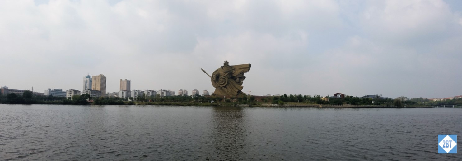 Our bus took a different route back to the ship and it was then that we noticed this giant statue of General Guan Yu (who we’d also seen in the shrine atop Shibaozhai). The pedestal alone is 10 m/32 ft and the statue is 48 m/157 ft high. For scale you can see a lamp post in the center and at this angle it barely tops the pedestal. Guan Yu is said to have built the city of Jingzhou with earth in the Three Kingdoms period, which was the time between the Han and Jin Dynasties in the late 2nd to late 3rd centuries AD.