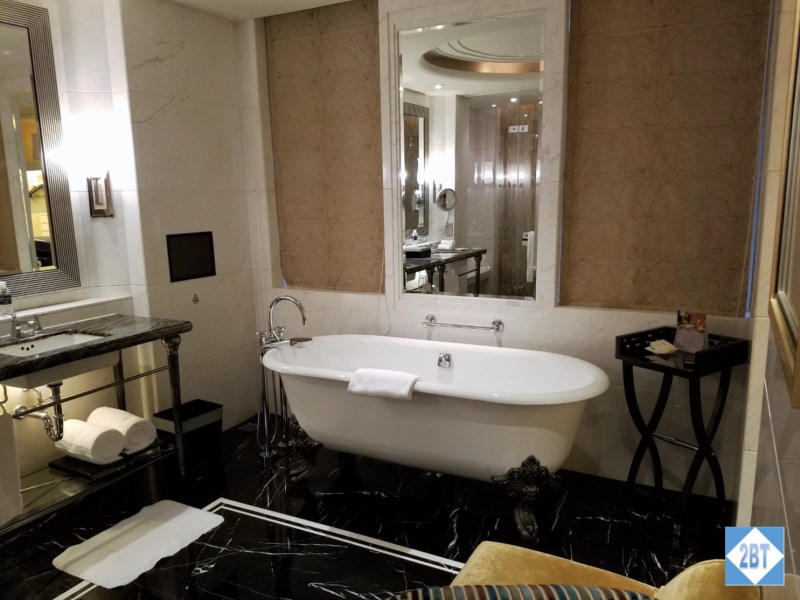 Fairmont Room Soaking Tub. One sink visible at left and the other is reflected in the mirror.