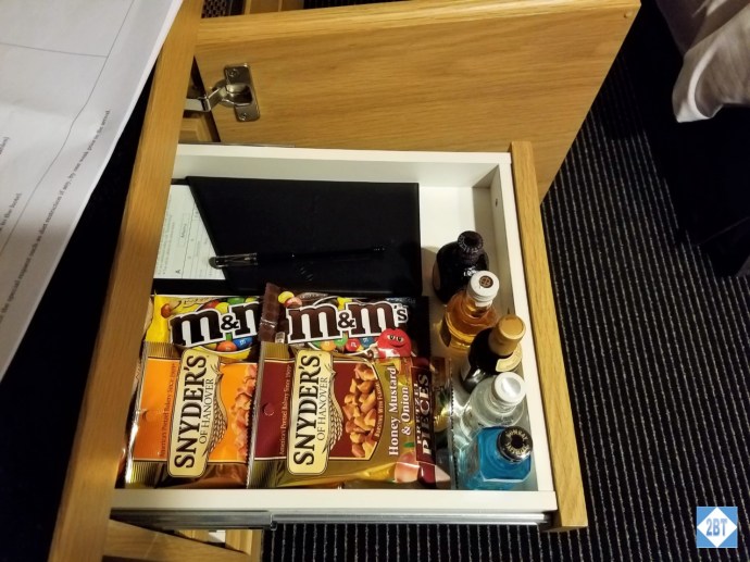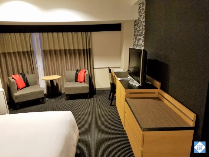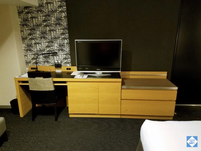 On the wall was a large furniture piece that incorporated the desk, mini-bar, fridge and drawers. It also served as the TV stand and a luggage rack. Once again there was no real place other than the floor to open up a clamshell suitcase so I just pushed the chairs closer together and set my suitcase on the floor beside them.