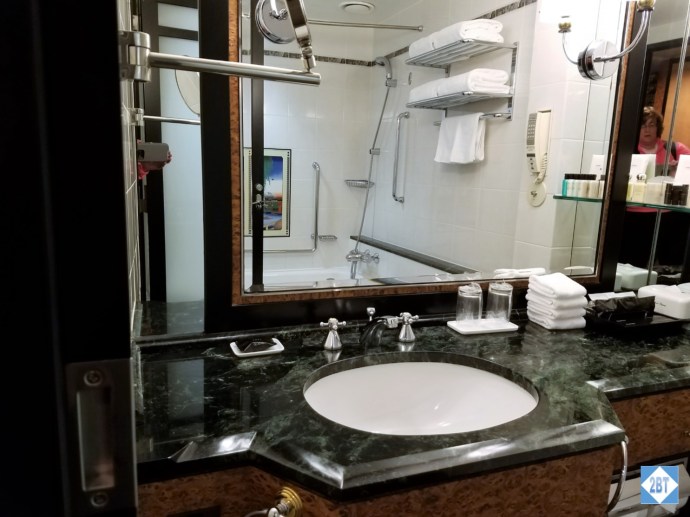 Our rooms were fairly high up and, conveniently, were connected. However, we had to ask management to unlock the connecting doors. The rooms were perfectly servicable though compared to our rooms during the first part of the tour, these were a bit of a let down. Like many hotel rooms upon entering the bathroom was to one side and beyond that was the area with the beds.