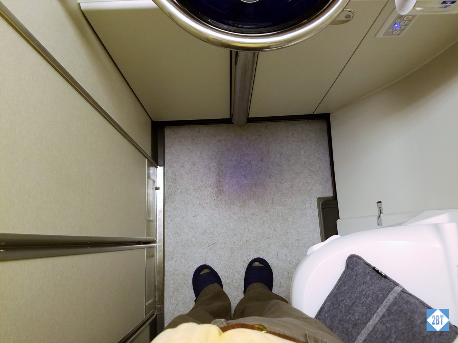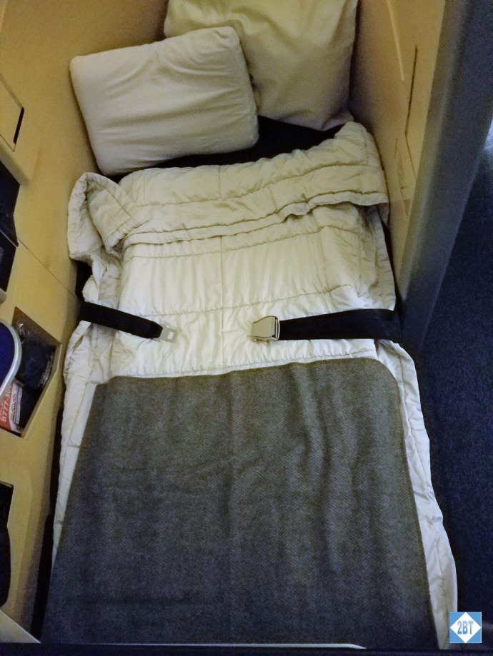 The ottoman was the width of the suite, so no cramped foot hole when sleeping – yay! I also loved that underneath there was enough storage space to put both my backpack and my shoes. If there had been others on my aisle I’d have stowed my backpack there but since I had the aisle to myself I stowed it overhead. Of course it figures that I have all this space and didn’t even need it!