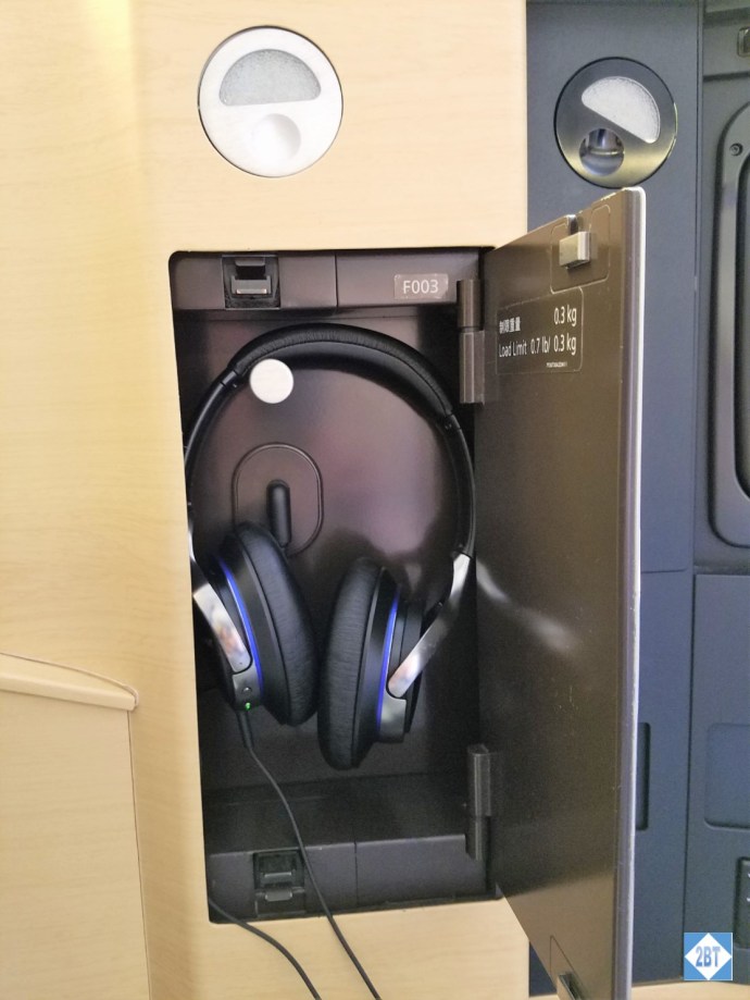 On the left panel was a door for the headphones – Sony, not Bose – which were perfectly adequate and were actually great when trying to listen to the PA announcements as the FAs’ voices were soft and the headphones filtered out the cabin noise,