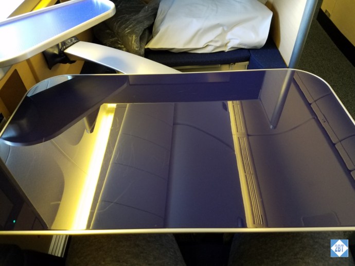 I loved the tray table, which sounds weird. When stowed, it was tucked under the shelf by the IFE screen but when released, it just glided toward the seat. This made it very easy to get in and out of the seat even when the tray was in use, There was also a smaller tray, perfect for drinks, on the window side.