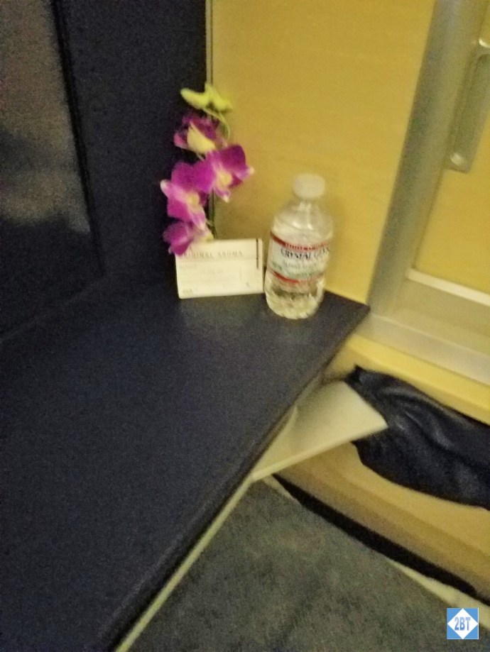 After stowing my carry-ons Mami suggested that I go ahead and change into my pajamas and led me to the lavatory. I was actually surprised at how small it was but then the other lav up front was even smaller. I really couldn’t complain, though. There was a small board to stand on while changing so my pants didn’t have to touch the floor, which was a fantastic idea. There were also extra amenities available like toothbrushes, mouthwash, etc. And the flower was a nice touch. I don’t recall ever using a lav where the water was turned on via motion sensor but I loved not having to touch the taps. When I exited the lav the FAs took my clothes and hung them up for me.
