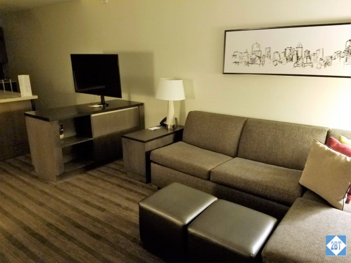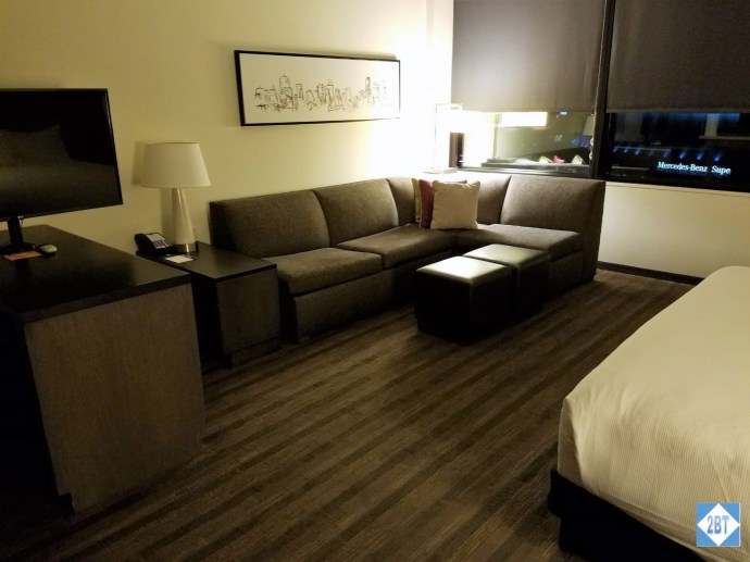 We stayed three nights here, using a combination of cash, the free night certificate that comes with the Chase Hyatt credit card and World of Hyatt points. I called in to make the reservation and got a fantastic agent who compared my corporate rate, member rate and the AAA rate to figure out which night was the cheapest so I could pay cash for that night and use the certificate and points for the other two night. Then she was able to put that all on one reservation for us, which was terrific. I’d hoped for a room with two beds, but none were available on points so we got a room with a king bed and a sleeper sofa.