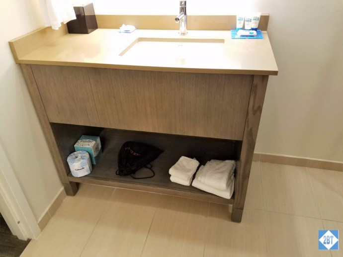The bathroom was pretty large and there was enough counter and shelf space for both mine and my friend’s toiletries. There’s an additional light that wraps around the mirror that really brightens the room and would be helpful as a makeup mirror. The bathroom door had a full-length mirror on the outside, so there was no shortage of ways to check your look.