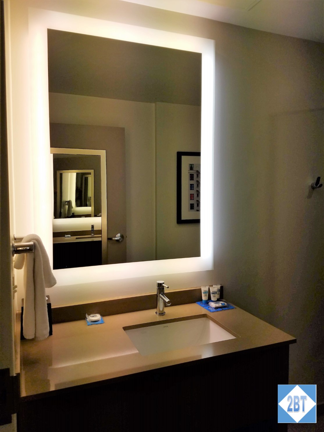 The bathroom was pretty large and there was enough counter and shelf space for both mine and my friend’s toiletries. There’s an additional light that wraps around the mirror that really brightens the room and would be helpful as a makeup mirror. The bathroom door had a full-length mirror on the outside, so there was no shortage of ways to check your look.