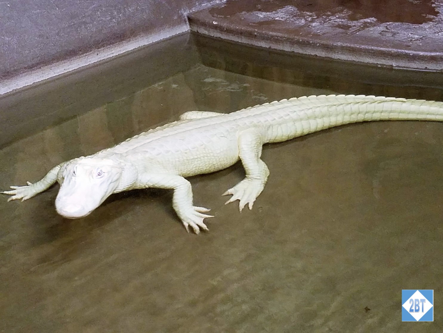 The bus picked us up at our hotel at 8:30 AM and there were two other stops, with one being just around the corner at the Hyatt Regency. We arrived about 9:20-9:30, in time to check in and pay. While tickets can be purchased with a credit card, items from the gift shop must be paid with cash. In one corner of the gift shop was this albino alligator. While their life expectancy is quite short in the wild, they do very well in captivity since there are no predators. Still, I felt bad for this girl as her pond was very small (though immaculate) and thought she probably needed more stimulation and enrichment activities.