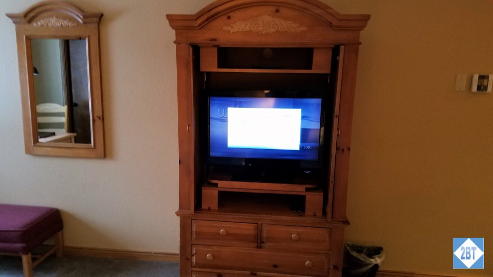Across from the beds was the entertainment center. The drawers in this piece of furniture, along with the two drawers in the nightstand were all that were provided. My ski luggage is quite large and not really practical to keep out and use as storage so I always unpack everything. The open closet had a single shelf. I ended up opening up the luggage stand and setting clothes on it as well.