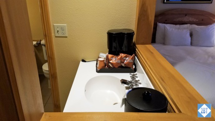 Across from the closet was what I guess might be called a kitchenette, though there was no microwave. It had a sink and the coffeemaker and ice bucket sat on either side. Below the counter was the mini-fridge. There was a microwave located in the vending machine area if we had needed it. I ended up using the ledge as a place to empty my pockets each night.