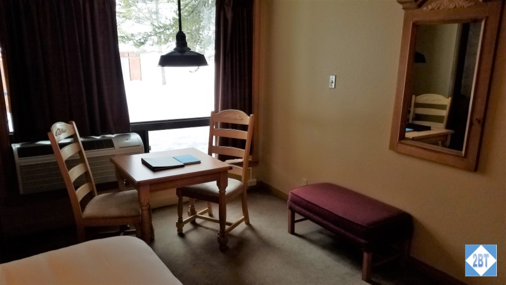 In front of the window was a nice-sized table. As both my roommate and I had our laptops, this space came in handy. The chairs were nice and firm and were a good place to sit while putting on/taking off ski boots. I assume the bench along the wall was really intended for that purpose and it might have worked for me except that the cushion was very soft, making me sink down to a lower height than was comfortable.