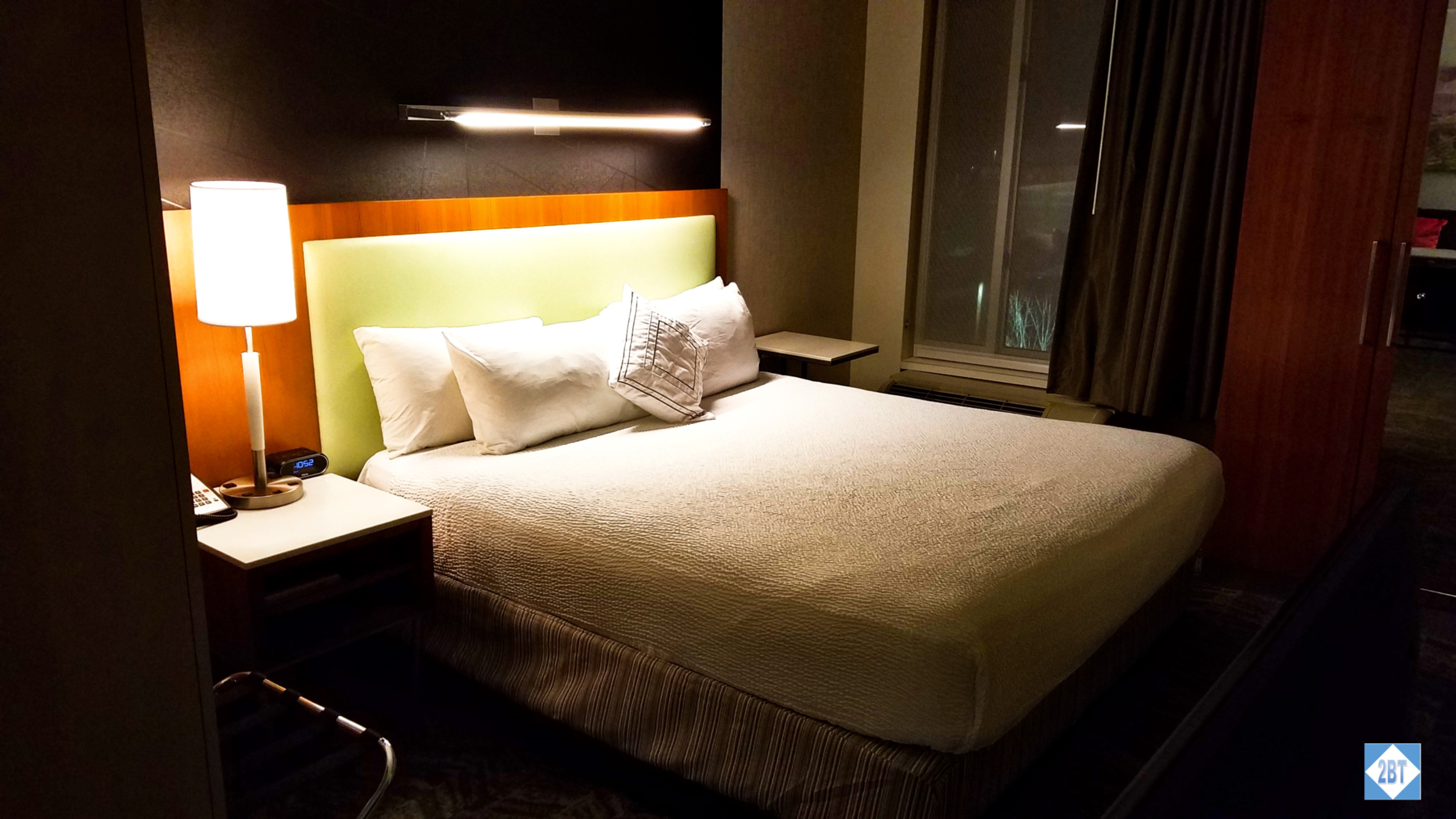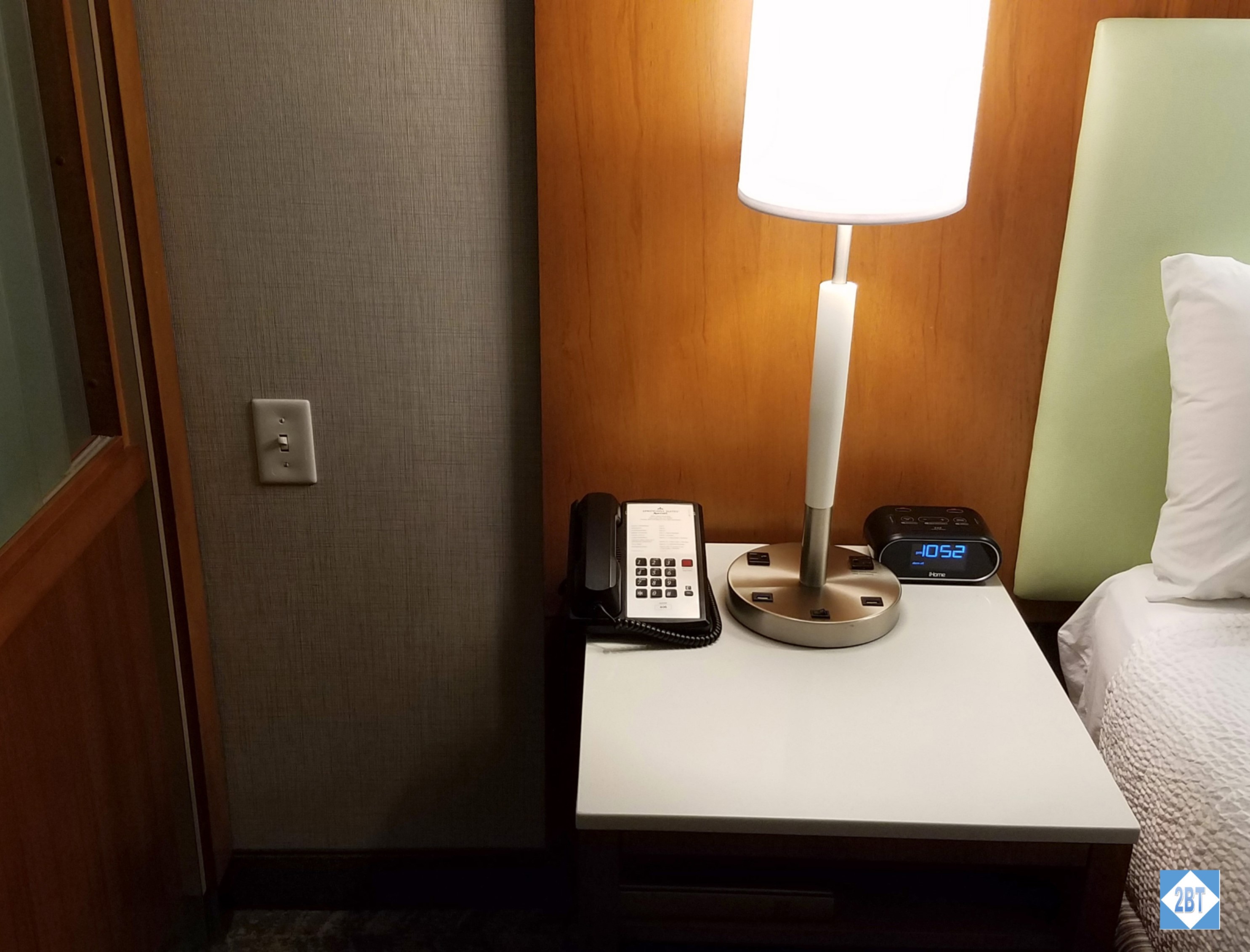 SpringHill Suites SLC Airport Bedside Table with Outlets and the poorly-positioned wall switch for the light over the bed