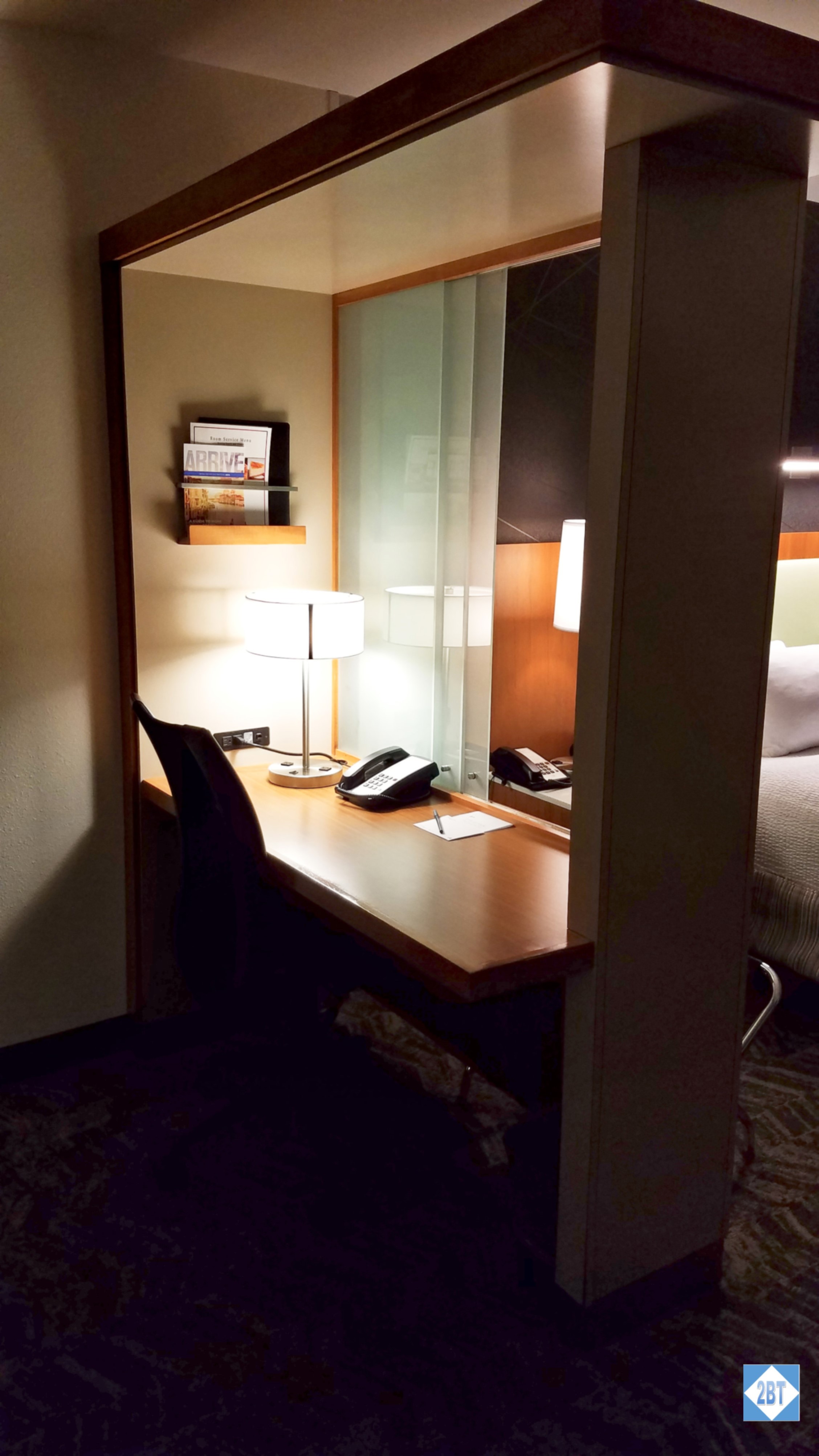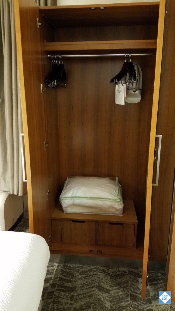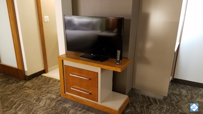 On the outside wall, next to the window (all directions face parking lots and other hotels, so don’t come here for the view!), was the wardrobe. It had a couple of small drawers in its base and there were a couple of drawers in the TV stand but those were the only ones I saw. That seems odd for a suites property where you’d assume the normal stay is a week or more. But maybe I’m wrong about that.