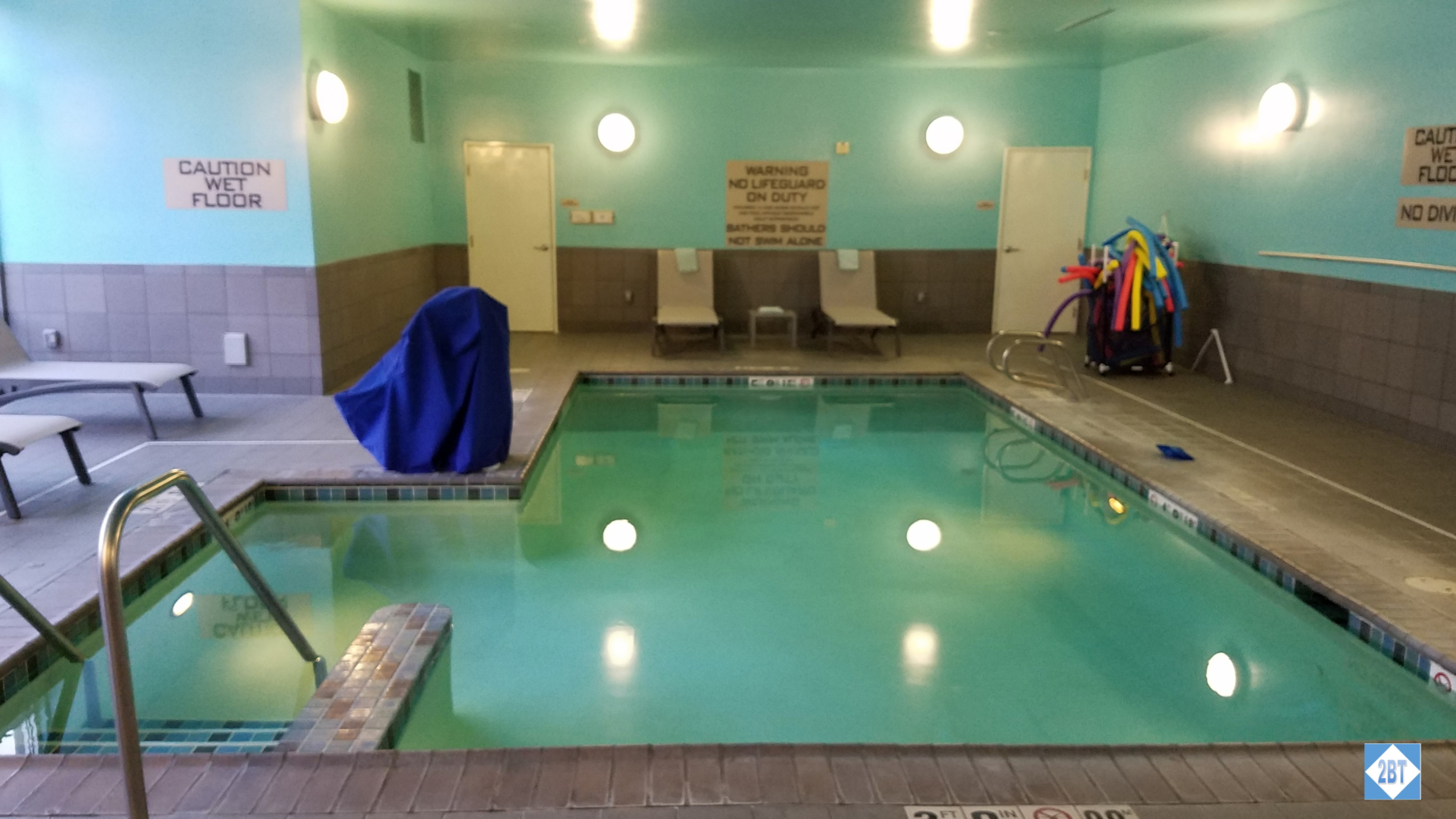 The hotel does have a small indoor pool. It is open from 6 AM to 11 PM. Outside was a patio. There was a similar patio on the front side that could be used for breakfast dining.