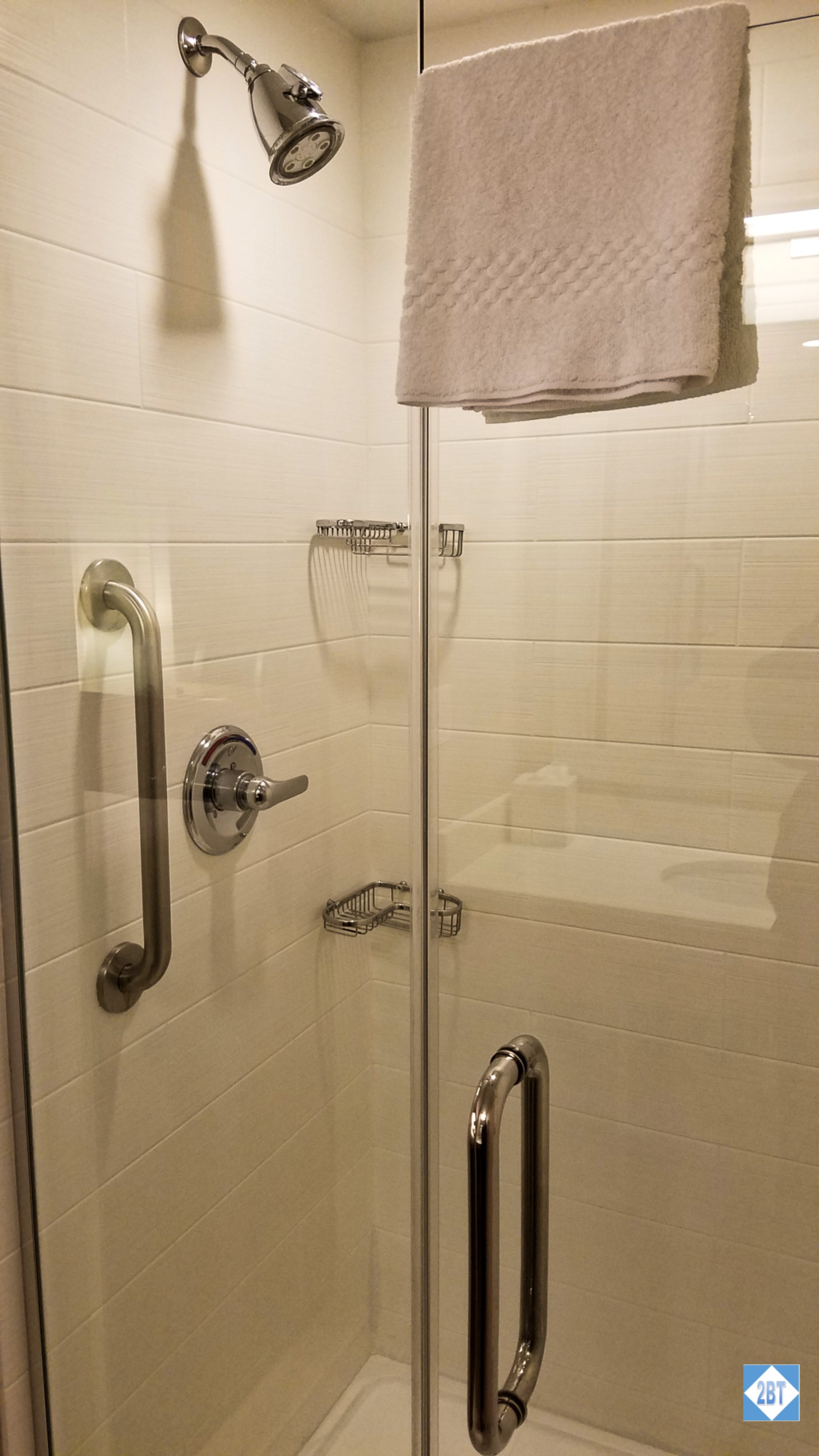 The second part of the bathroom had more blue/fluorescent lighting and contained a walk-in shower on one side and on the other a counter running the full width of the room with a sink. It also had some shelving beneath the counter where one could store a toiletries kit and where the hair dryer stayed. The wash cloths were stored in the half-bath section so I had to be sure to grab one before taking a shower. There was no way to point the showerhead such that you didn’t get wet when first turning it on. I’d rather wait for the water to warm up before it hits me though at least it warmed up pretty quickly. At least I was able to adjust it to produce the very strong spray that I like. I just found this whole divided setup weird though I can see how it makes better use of the space, especially if there are two people staying in the room.