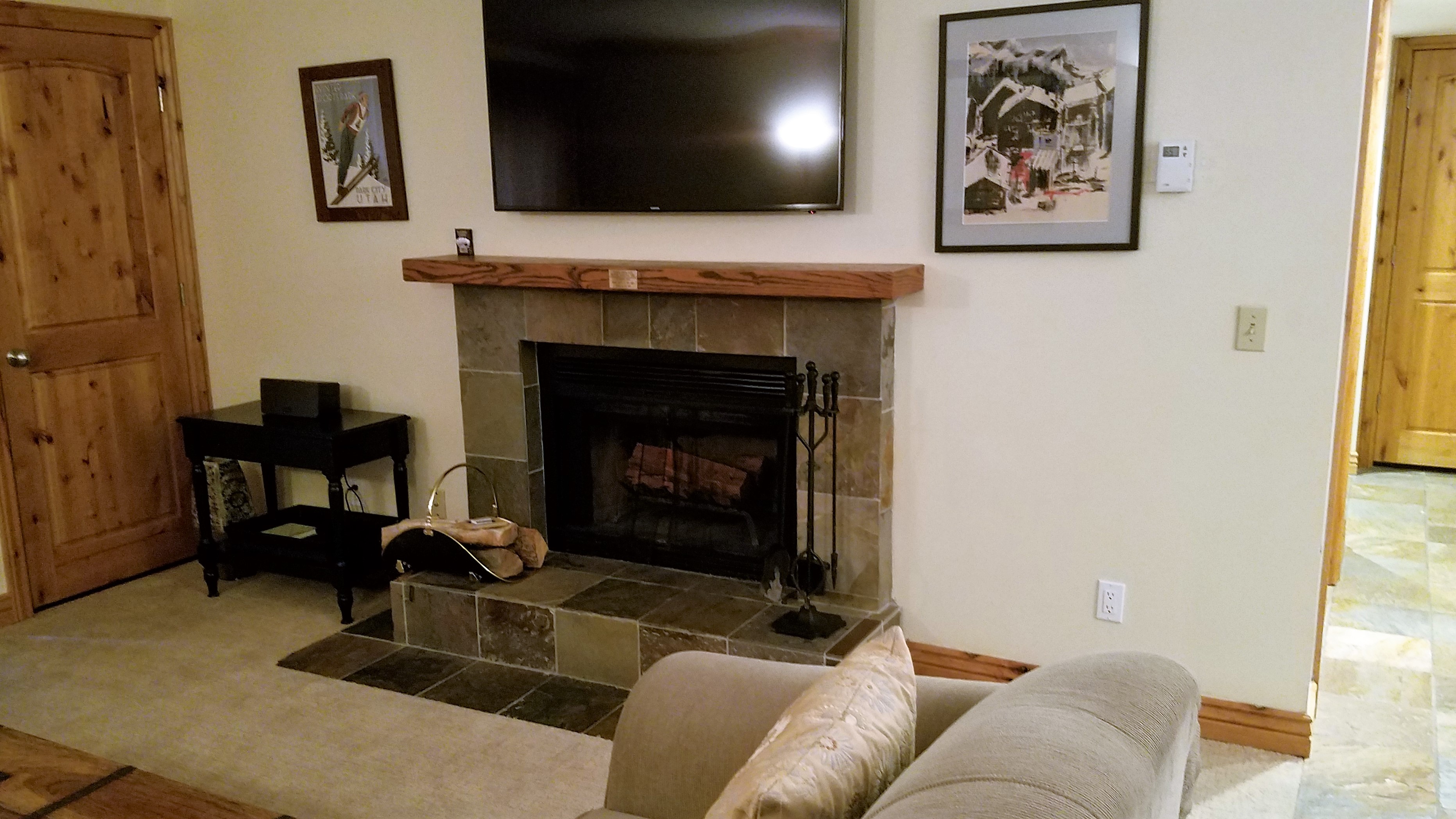 Across from the sofa was a working fireplace (not gas) with the TV mounted above it.