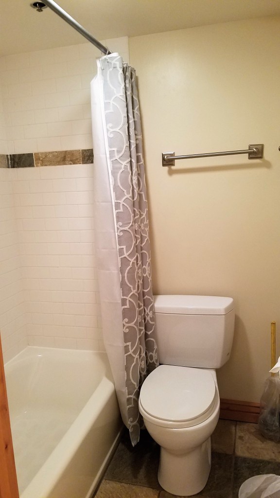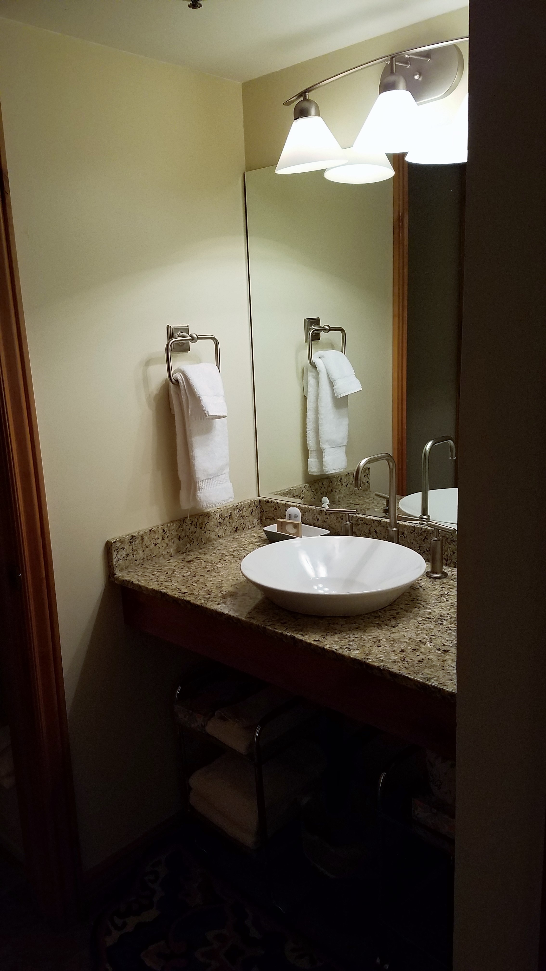 Our bathroom was the one in the hall. Like the master, the sink was outside the room with the toilet and shower/tub. This actually works well for non-couples. There was no permanent shelving under the sink but I thought the rolling shelves were a great idea for the extra towels. The counter was just wide enough on each side of the sink for us to put our toiletry bags.