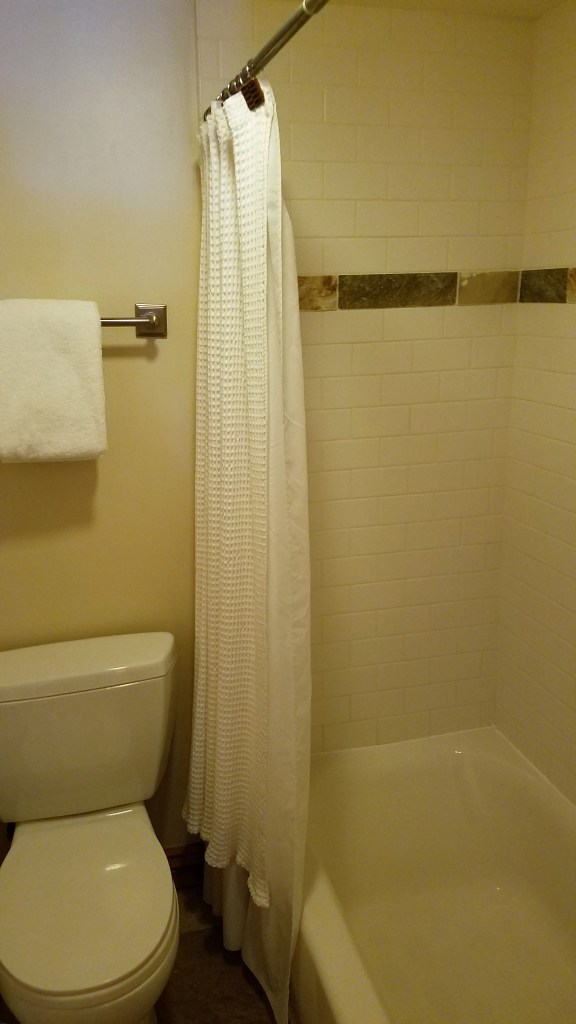 One frustrating thing was the lack of accessible electrical outlets. I believe she may have had one on the outside wall of the bedroom but I did not have one anywhere near my bed. Fortunately there was a shelf overhead where I could put my tablet each night and empty my pockets at the end of the day but my phone had to stay across the room each night so it could recharge. That’s where I left my tablet during the day while we were out.